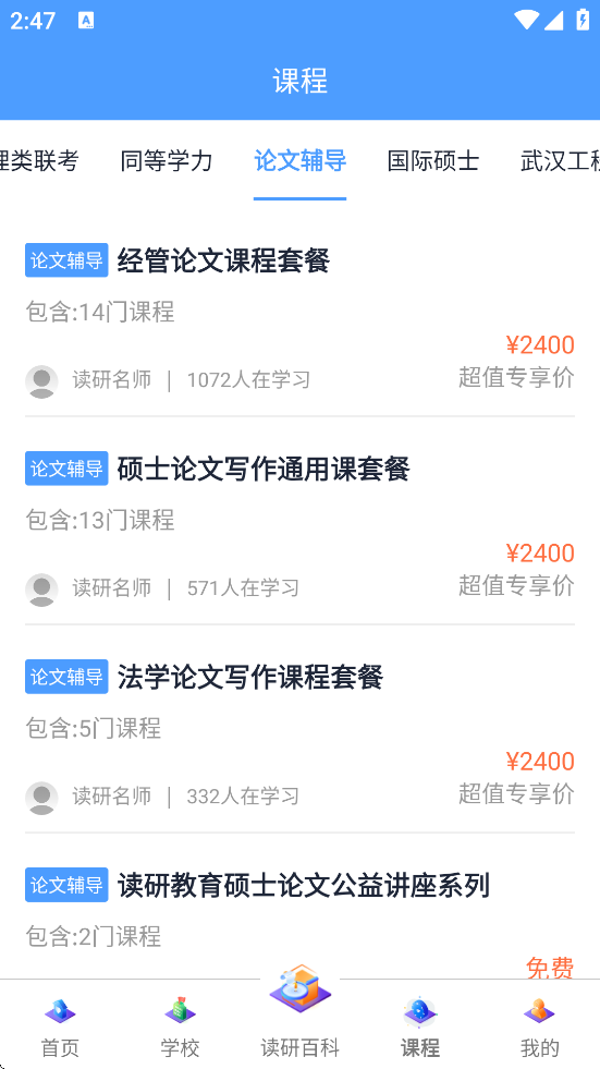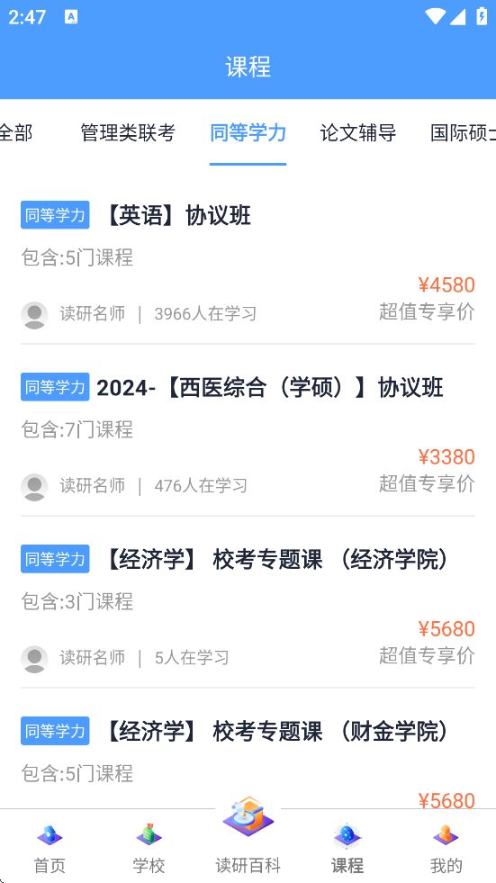 管理类联考、同等学力申硕等课程可按学科分类筛选。