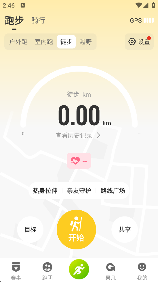 点击“跑步”页面,选择“户外跑”或“室内跑”模式,开启运动轨迹记录。