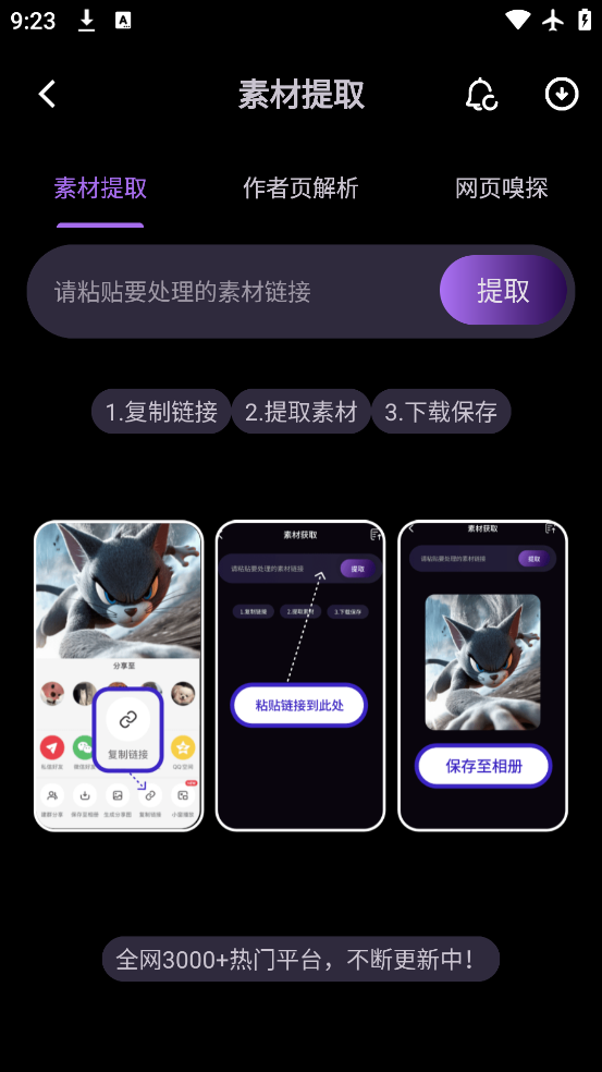 3、支持抖音、小红书等 3000 + 热门平台音视频、图片无水印提取。