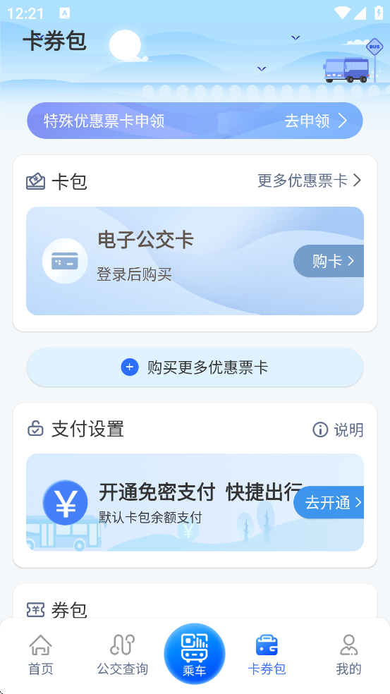 打开APP后,在首页点击“车票查询-实时班车”或通过“卡券包”进入购票页面。