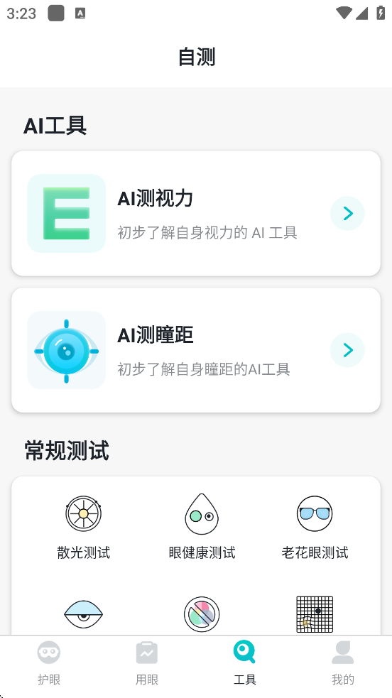 1、眼健康自测:包含色盲、色弱、散光等测试功能,快速筛查视力问题。