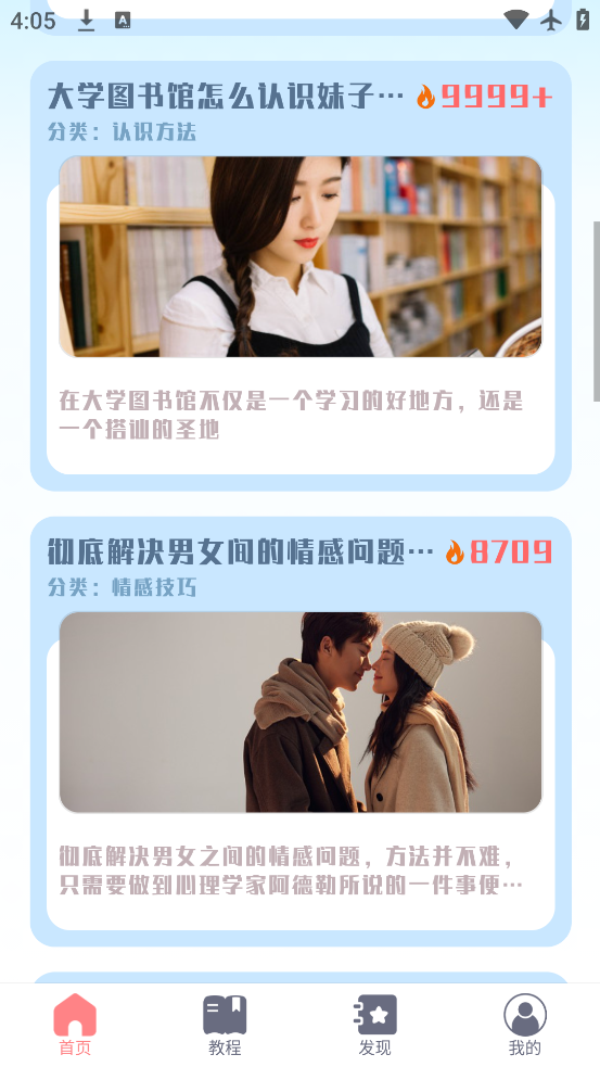1、内置实战案例板块,用户可在里面任意选择案例在线赏析,学习恋爱知识。