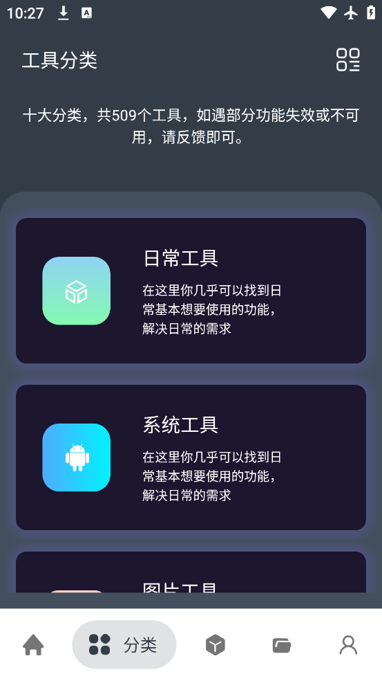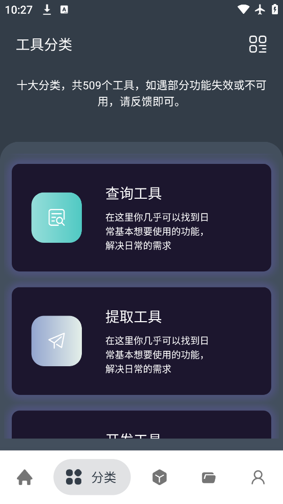 2、点开工具分类,有日常、系统、图片、查询、提取、开发、文字、计算、趣味游戏、其他这十大分类,目前共有353个工具,点击右上角可以切换样式。