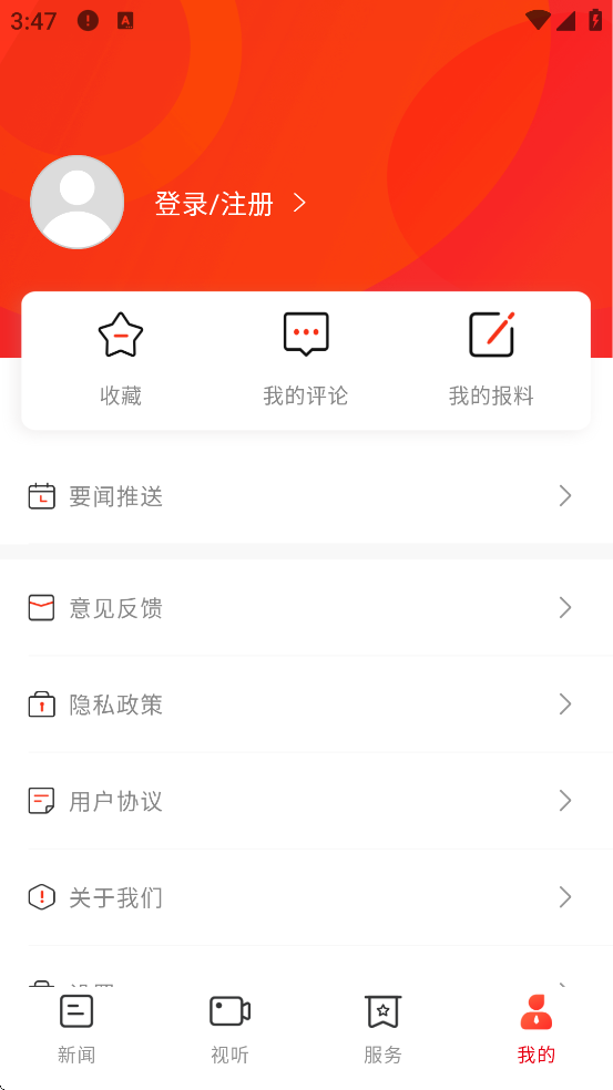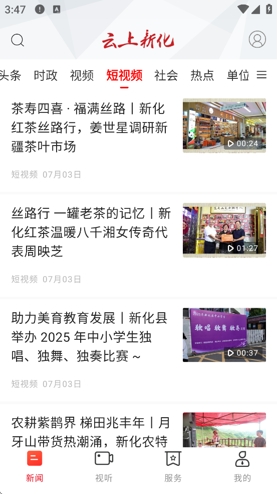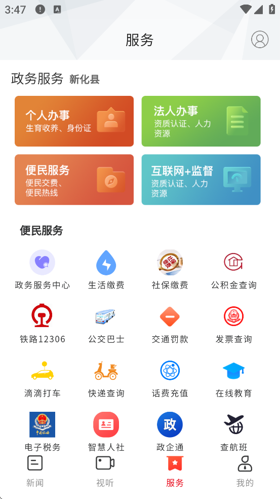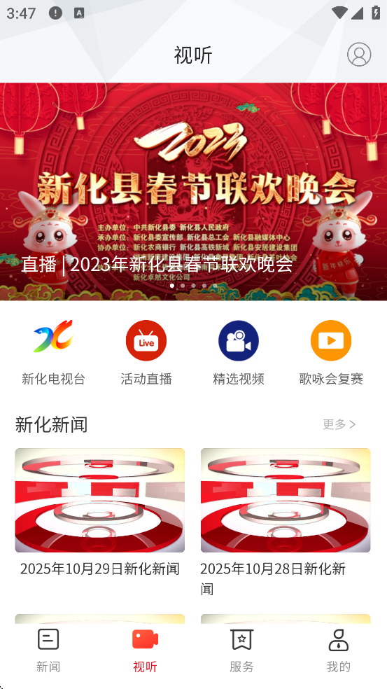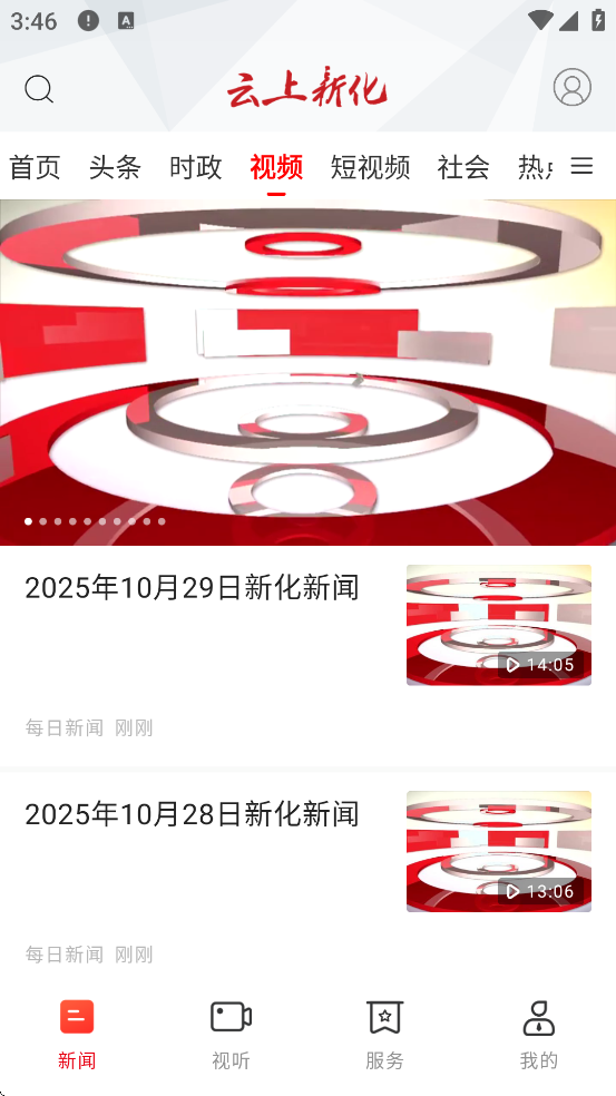 打开应用后,通过底部菜单栏切换“新闻”“视听”“服务”等板块。