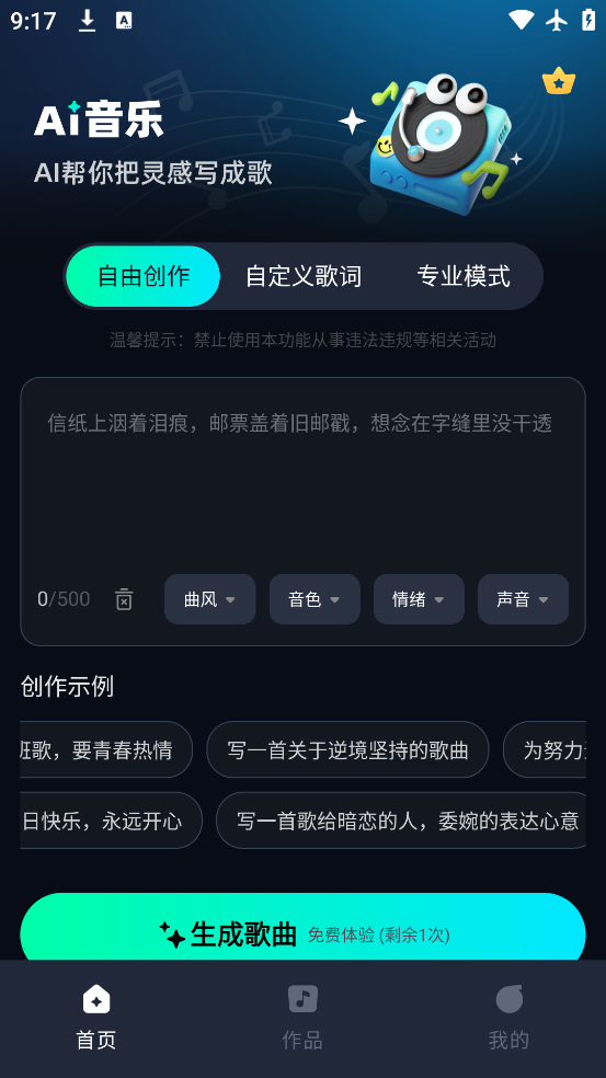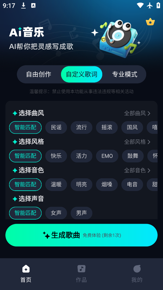 3、智能创作:无需专业音乐知识,选择风格、曲风、音色等,AI 瞬间生成专属旋律,无论是流行、古典、摇滚还是电子音乐,都能精准匹配你的需求,让每个人都能成为音乐创作者。