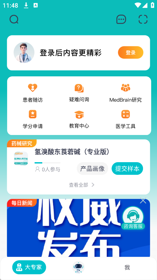 3、权威医学资源整合:整合院士专家经验智慧、学术交流、临床指南等海量工具信息,为医患双方提供精准可靠的医学支持。