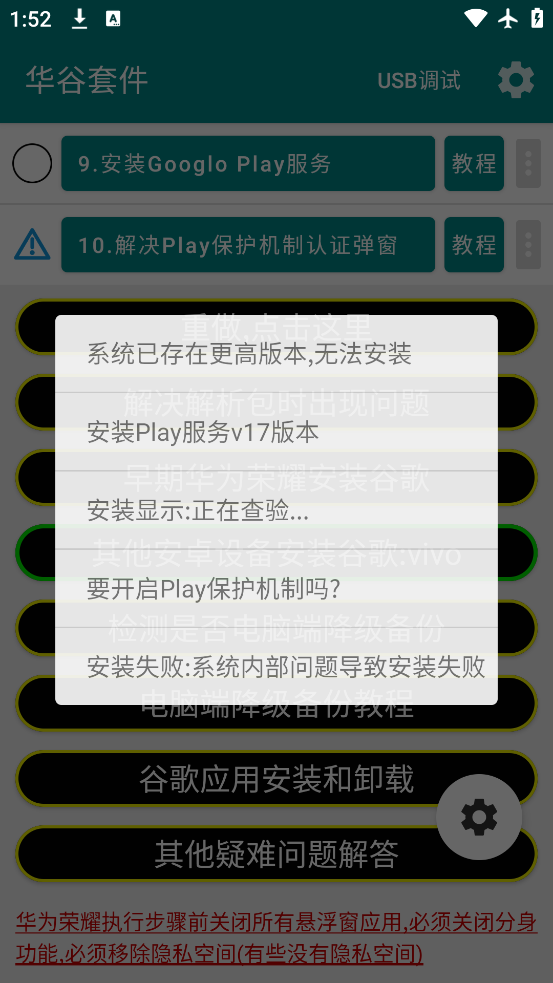 1、适用于Android 7.0及EMUI5.0,低于这些版本将提示“该设备版本不支持GMS安装”。