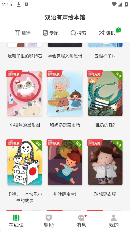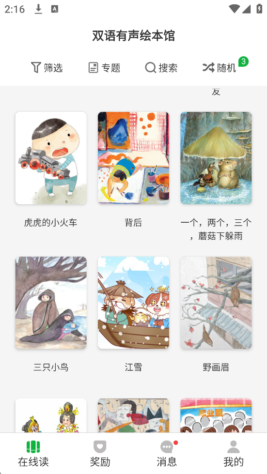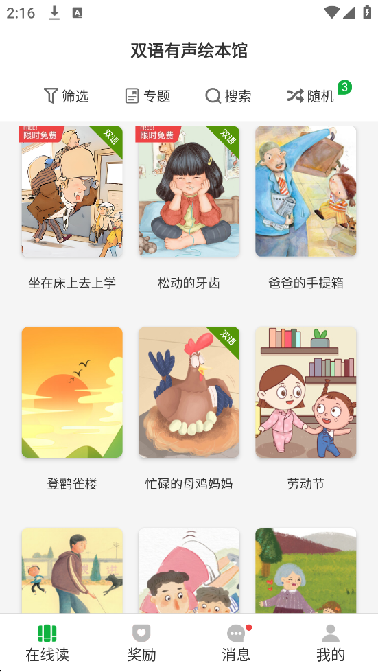 进入首页后,点击左上角的筛选按钮,可根据年龄、语言、主题(如安全教育、数学启蒙等)快速定位绘本。