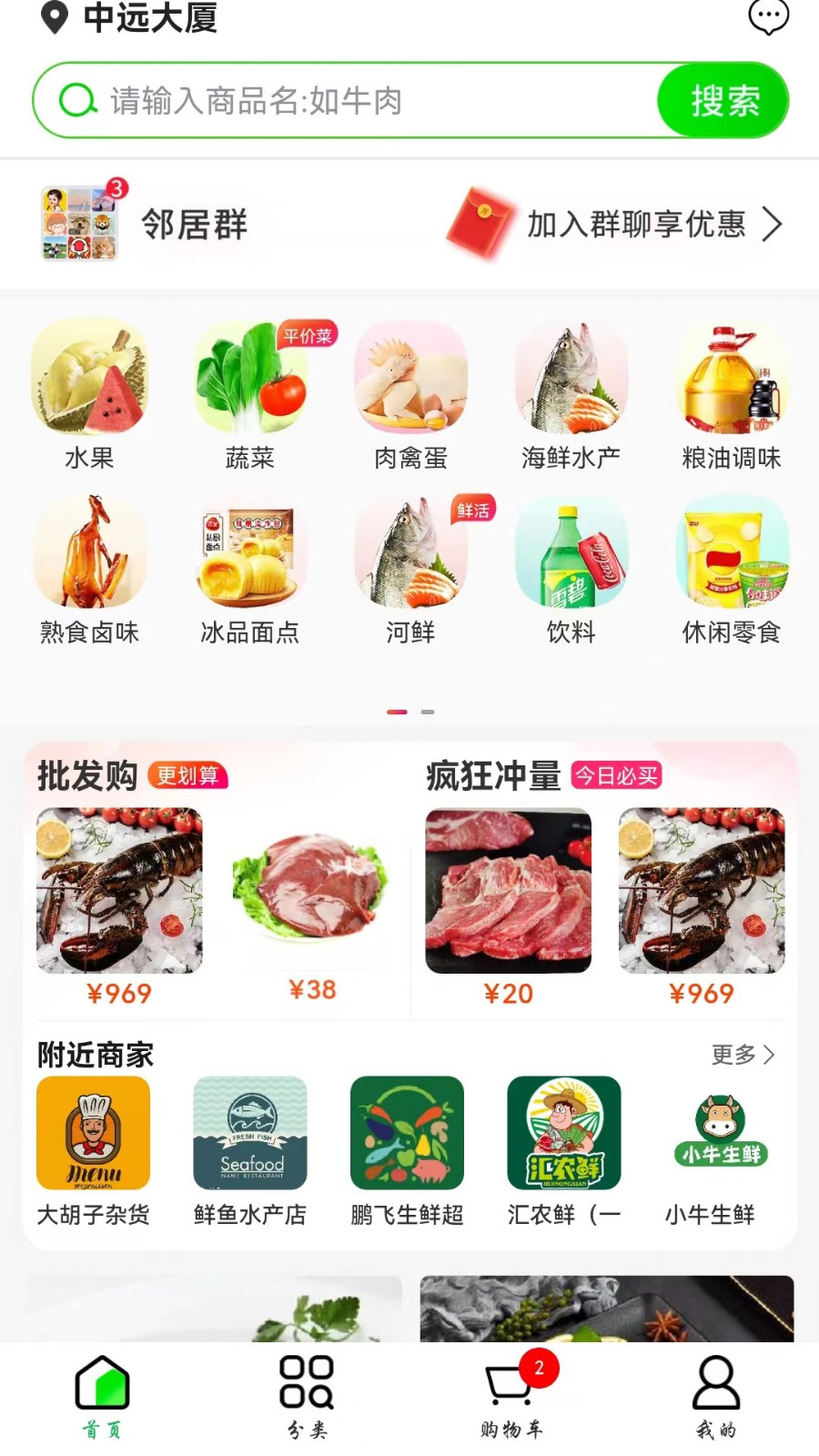 在首页浏览分类(如蔬菜、水果、肉类),或直接搜索商品名称。