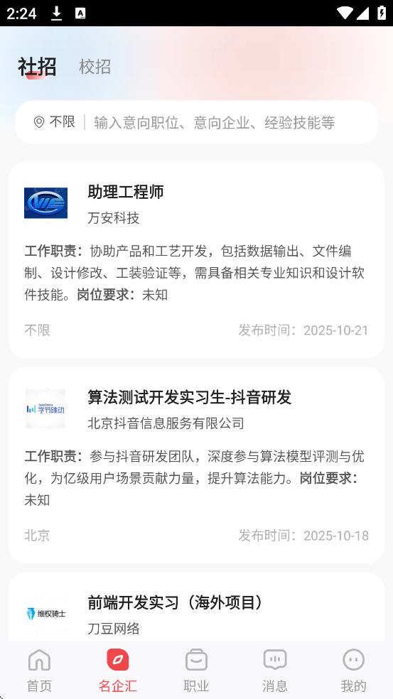 2、名企汇模块:汇聚知名企业招聘信息,拓宽就业选择。