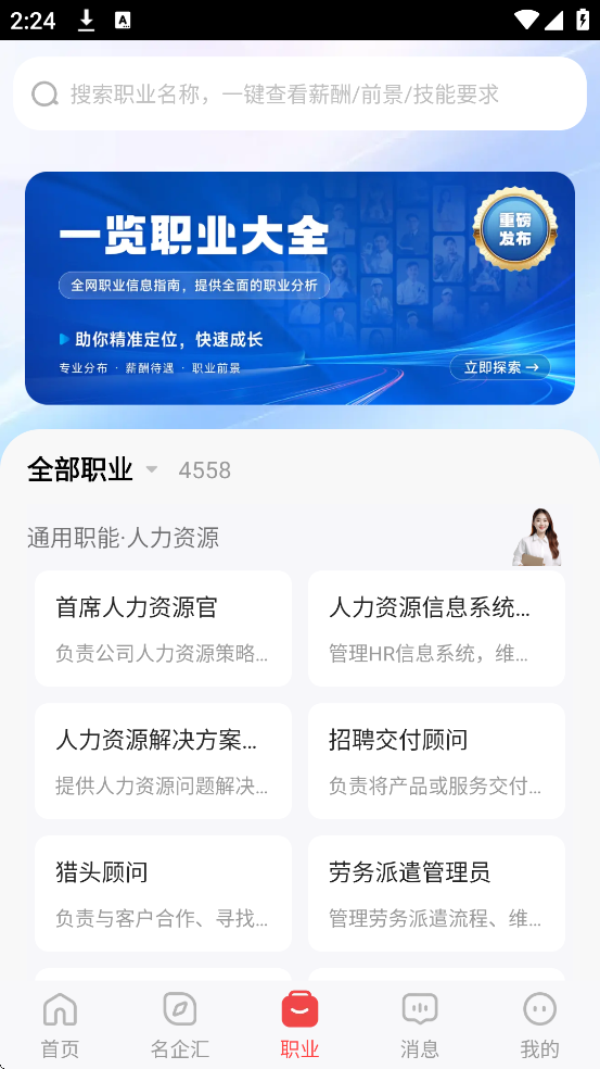一览职业APP是一款专注于求职招聘的移动应用,主要服务于专业技术人才,覆盖电力、石油化工、机械等多个行业。其核心功能包括三维立体简历(支持语音介绍和形象照片)、精准职位推荐(依托行业细分和大数据算法)以及薪酬查询(实时更新行业工资待遇)。特色功能涵盖即时沟通系统(与HR实时在线聊天)、求职动态追踪(面试通知、进展实时更新)以及职业大全指南(提供行业趋势和岗位分析)。亮点在于新增的名企汇模块,汇聚知名企业招聘信息,进一步拓宽用户就业选择。