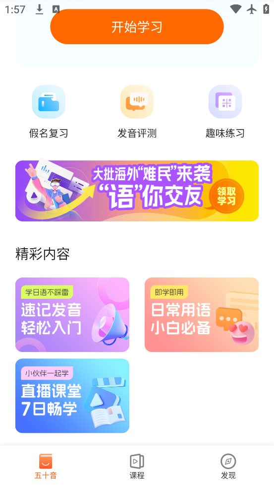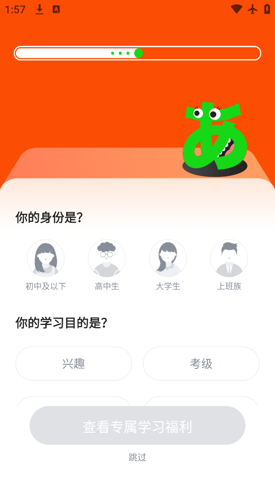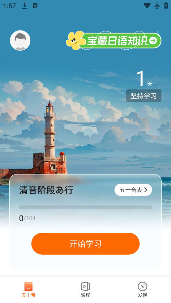 1、打开五十音图app先完成水平测试,系统会根据你的结果制定个性化的学习计划,从基础开始学起。