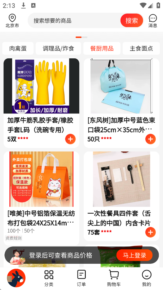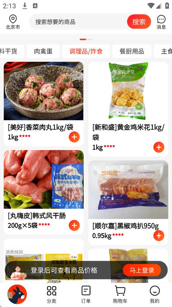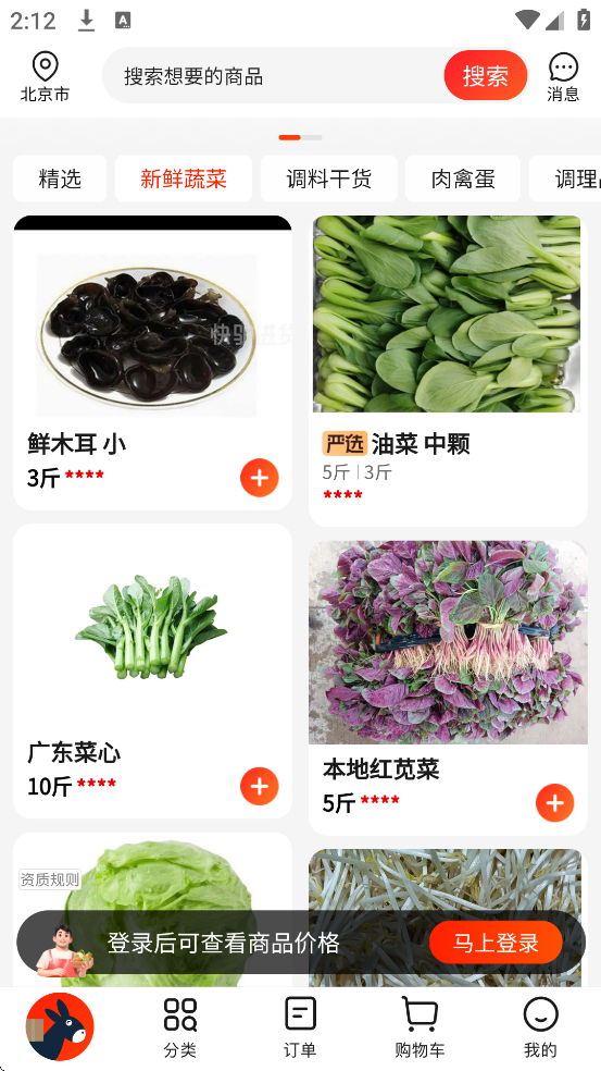 1、线上采购:商家可通过APP完成全品类食材下单,覆盖蔬菜、肉类、粮油、冻品等,支持搜索、分类浏览及一键加购功能。