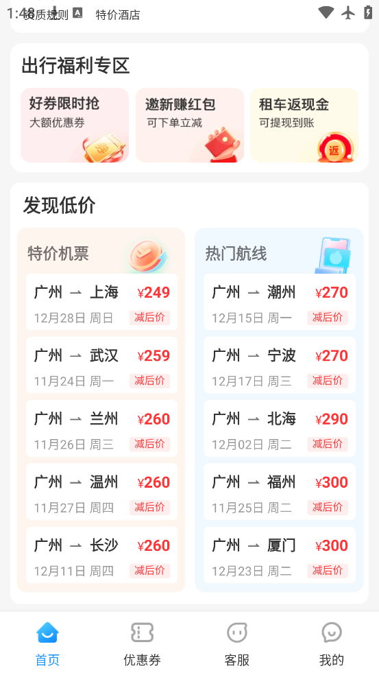 3、价格优惠多,线上预订便宜,机票低价销售,实时查看价格。