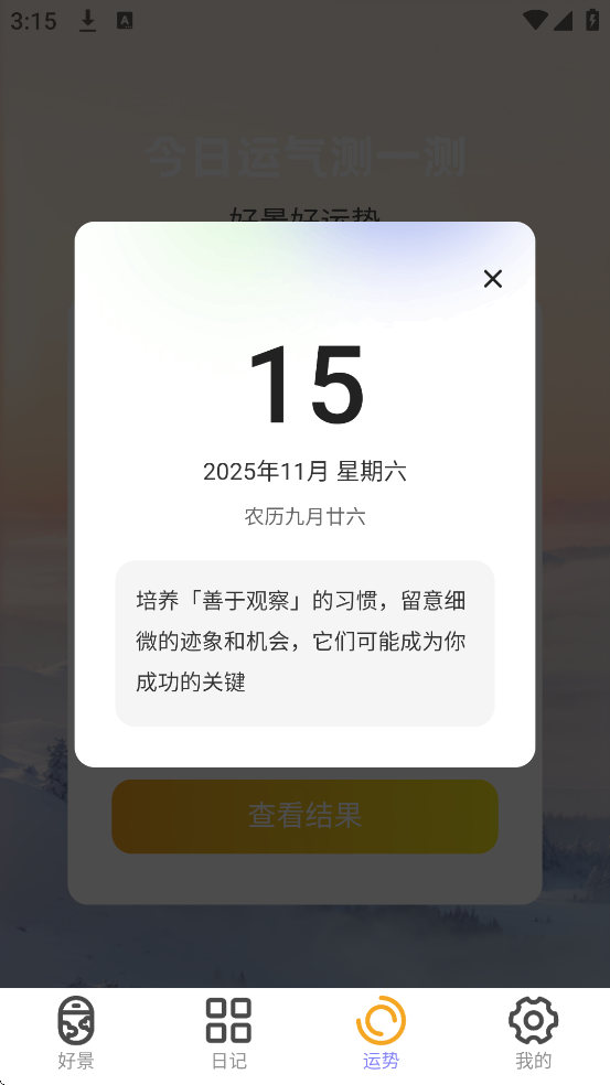 通过“今日运气”功能获取每日运势预测,为旅行增添神秘感。结果以卡片形式呈现,支持快速打卡。