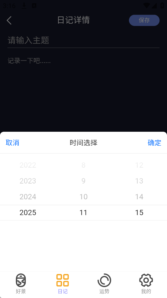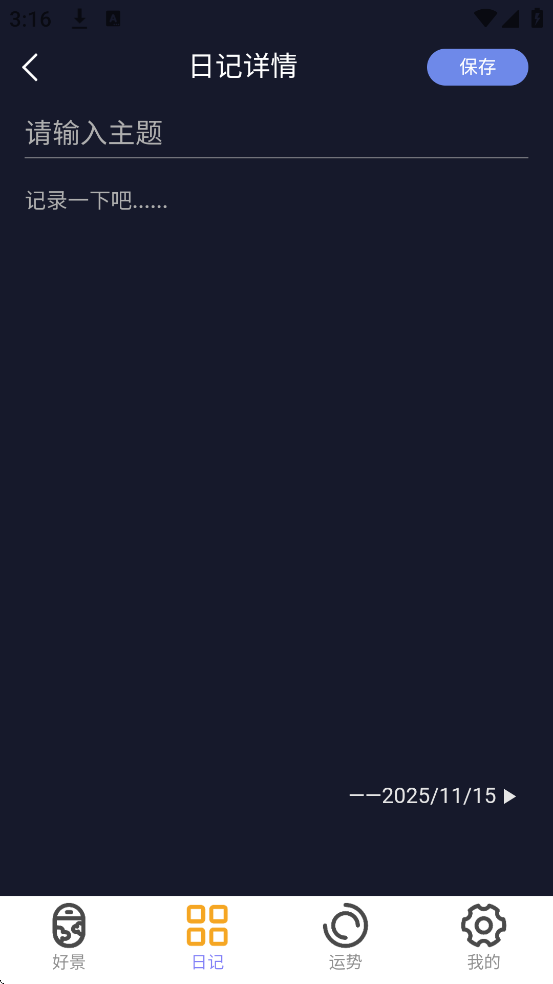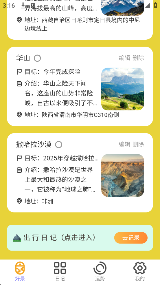 点击添加按钮,输入地点、目标及旅行感受,随时记录旅途点滴。保存后以卡片形式展示,方便回顾和打卡。