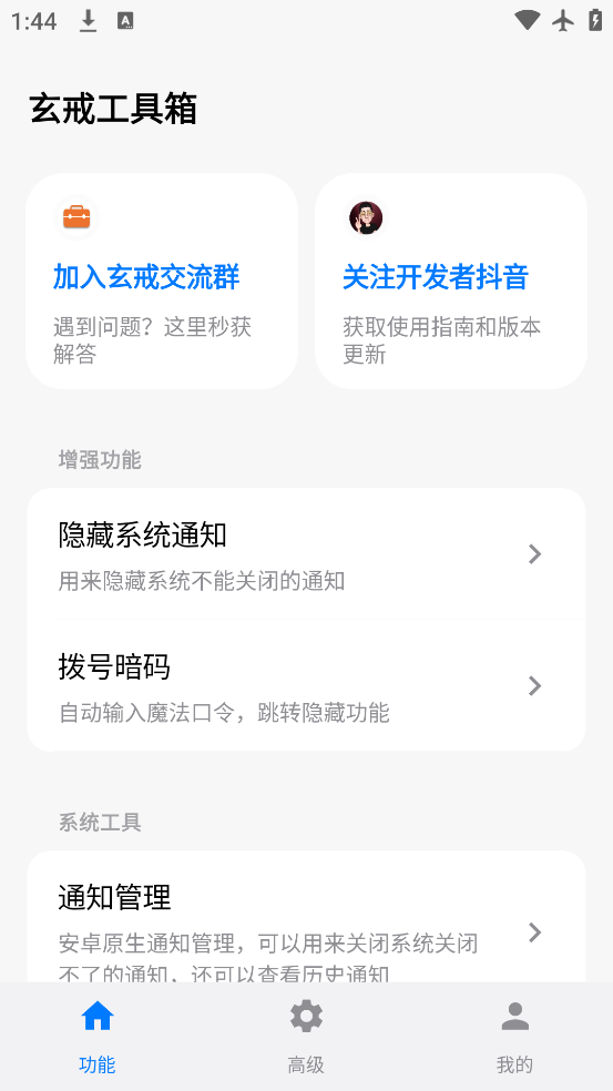 2、然后我们打开玄戒工具箱,基本的功能,也就是不需要Shizuku授权的,是可以直接启动使用,例如小米手机用户知道的拨号暗码功能是可以直接使用