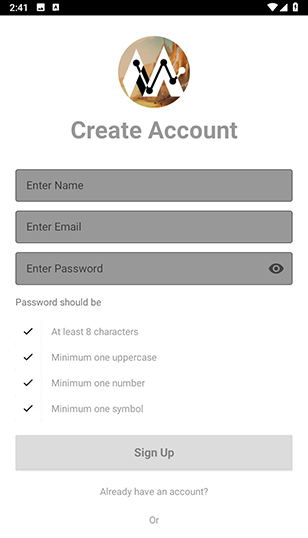 2、若无账号,点击“Doesn'thaveanaccount”,输入姓名、邮箱及符合要求的密码,完成注册即可。