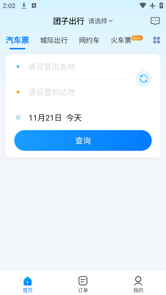 1、打开并登录团子出行app,在打开的页面中就可以看到汽车票预订页面,用户只需要在这个页面中输入出发地、到达地,以及选择出行日期后点击【查询】按钮即可查询余票情况