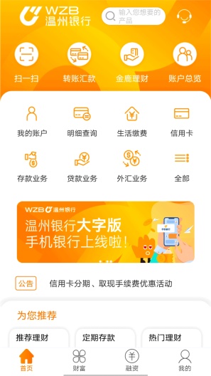 温州银行软件安卓版下载安装是一款手机银行软件,软件内为用户提供线上服务功能,用户可以通过软件办理银行卡相关业务,同时软件内为用户提供多重安全保障,更多惊喜等你来发现,如此好用的软件,你还等什么?感兴趣的小伙伴快快下载前来体验吧!