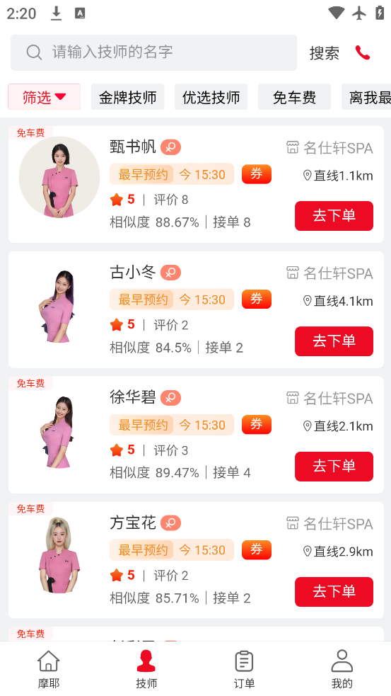 3、用户在确定好需要的服务项目后可以立即查看相关的技师,选择喜欢的技师。