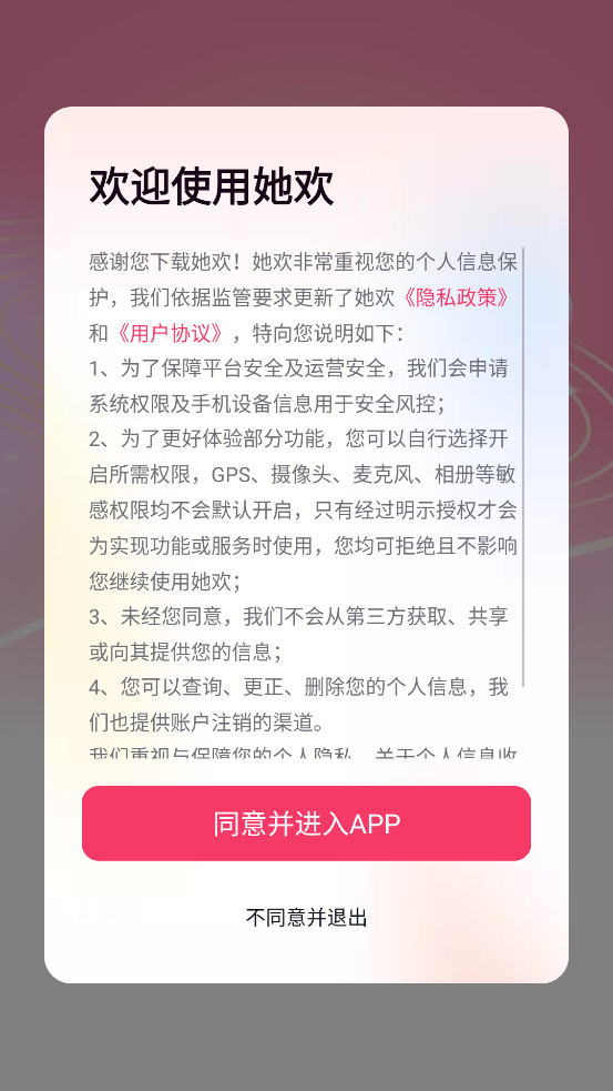 她欢app最新版下载是一款非常优质的社交类应用软件,里面聚集了很多有交友、找对象需求的优质男女,用户在手机上安装此应用后,即可随时进入软件查看在线的人,遇到想认识的人可即时与其展开各样交流互动、快速破冰,轻松认识新朋友。