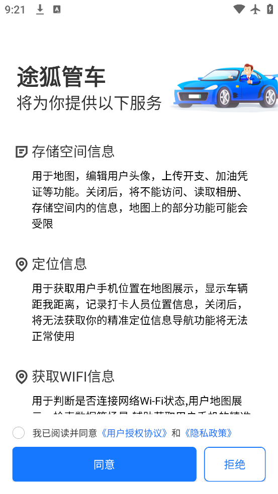 3、途狐管车app官方下载可以通过应用端使用用车申请、保养提醒和打卡功。