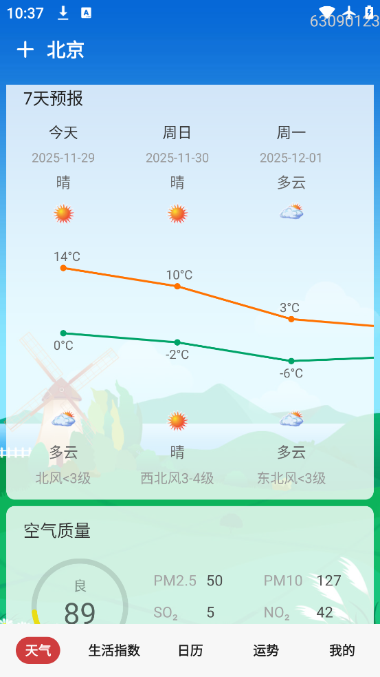 1、空气质量——涵盖3162个县市的实时空气质量指数;并加入5天雾霾预报。