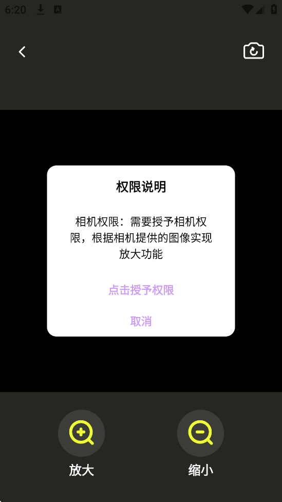 启动后默认进入放大模式,双指捏合屏幕或拖动底部滑块调整倍数(最高15倍)。