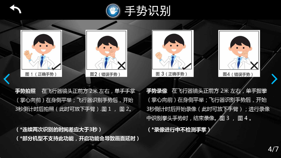 3、智能交互:声控飞行、手势识别拍照/录像、轨迹自动飞行。