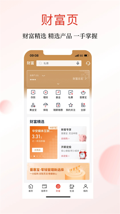 理财:在“财富”板块浏览产品,按需购买。