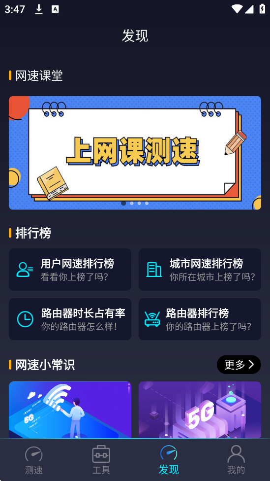 1、一键测速:查看手机网速,2G、3G、4G、5G、Wifi都可使用。
