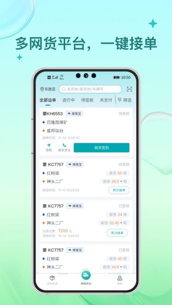 1、多货源聚合平台,一个APP内操作多个网货平台的货源和运单,大大提升工作效率。