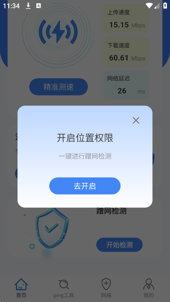 1、测网速:首页就有“一键测速”按钮,点一下就能看到下载、上传速度和延迟。