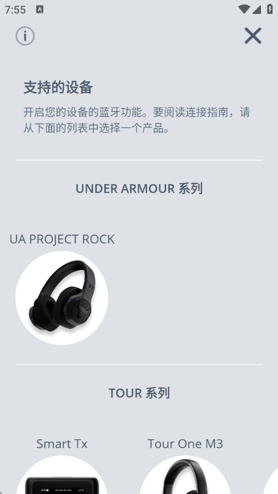 1、下载安装并打开JBL Headphones app,点击左上角感叹号按钮