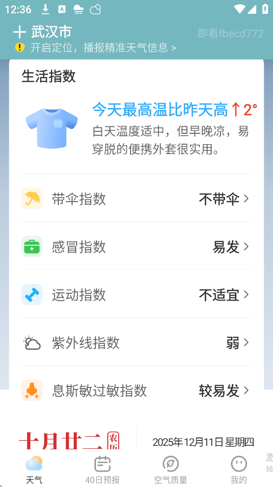 打开App,它会自动定位你所在位置,直接显示当前温度、湿度、风速等数据。
