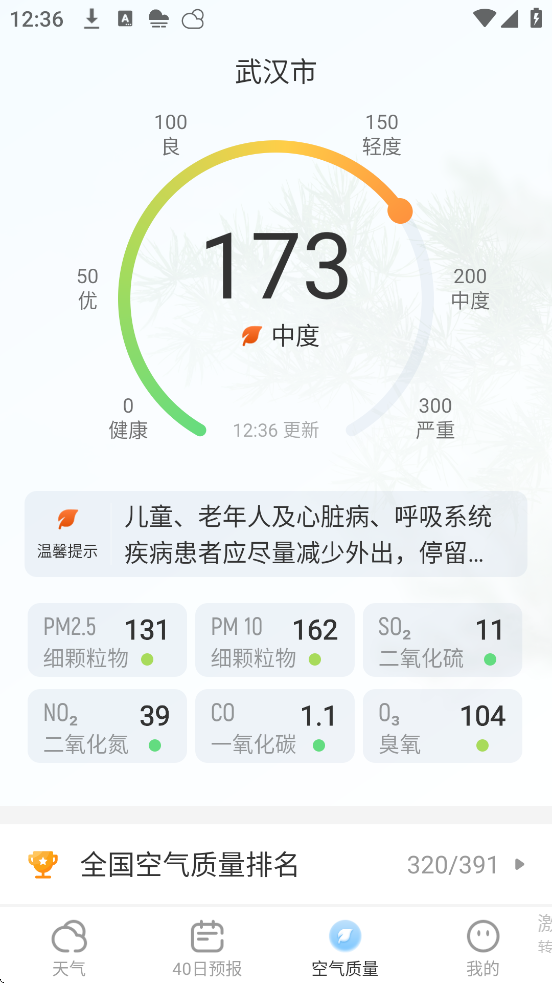 1、界面简洁美观,动态背景随天气变化,数据来源权威且支持多城市添加。