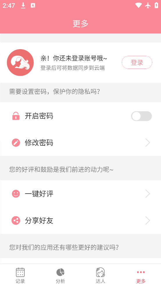3、设置经期保护的密码,将个人的隐私安全保护,提高经期保护的质量,让你知道具体的经期信息,更安全。