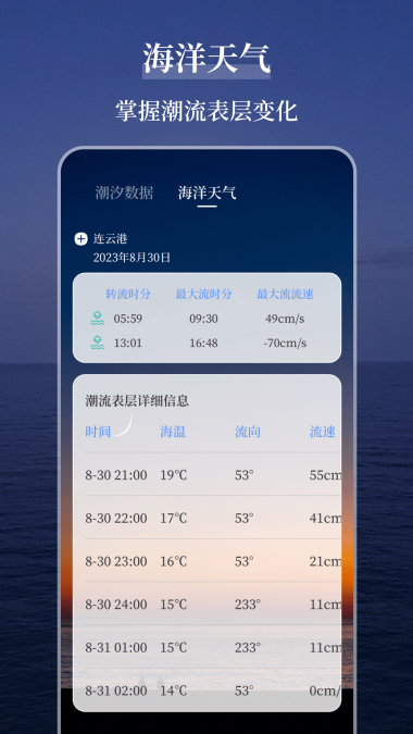 2、具备潮汐、浪高、风速、风向等海洋专属气象信息,帮助用户提前做好航行或作业准备。