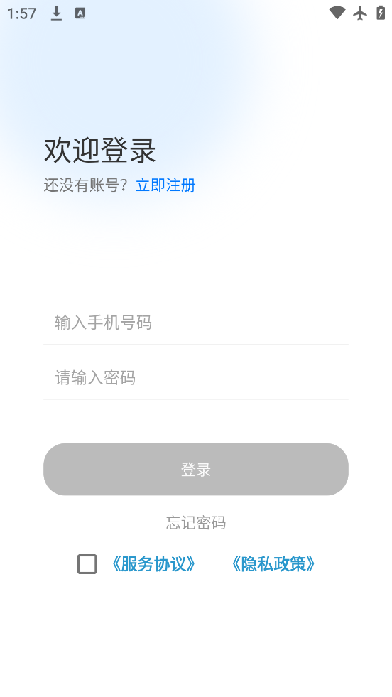 1、登录界面,显示欢迎登录,可输手机号和密码登录,未注册可立即注册,需勾选协议,有忘记密码选项。