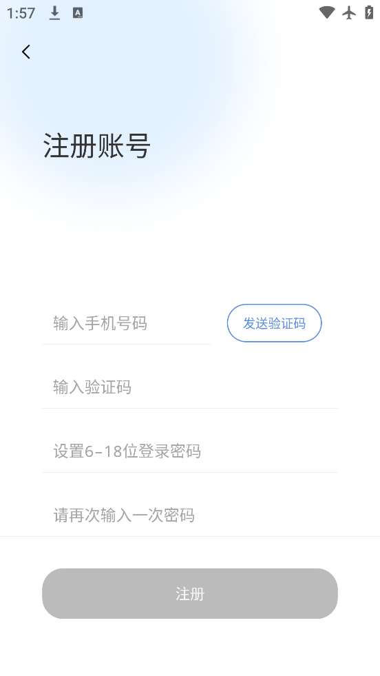 2、注册界面,标题注册账号,需输手机号、验证码,设置并确认密码,完成后点击注册。