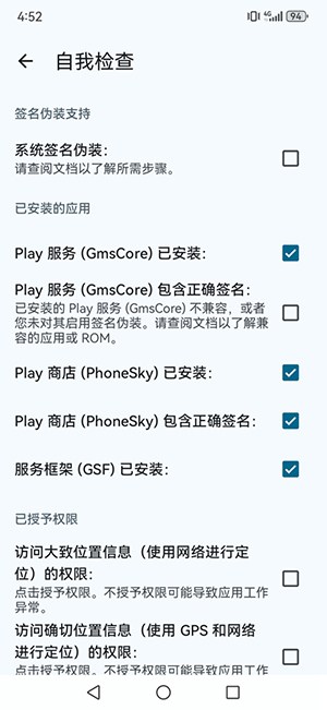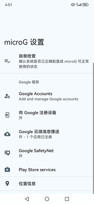建议开启microG设置中的自检功能,并配置位置服务后端。