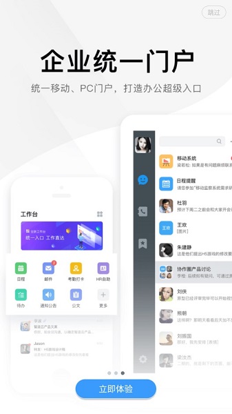 2、企业统一门户:统一移动、PC门户,打造办公超级入口。