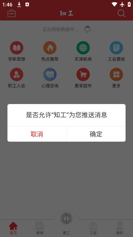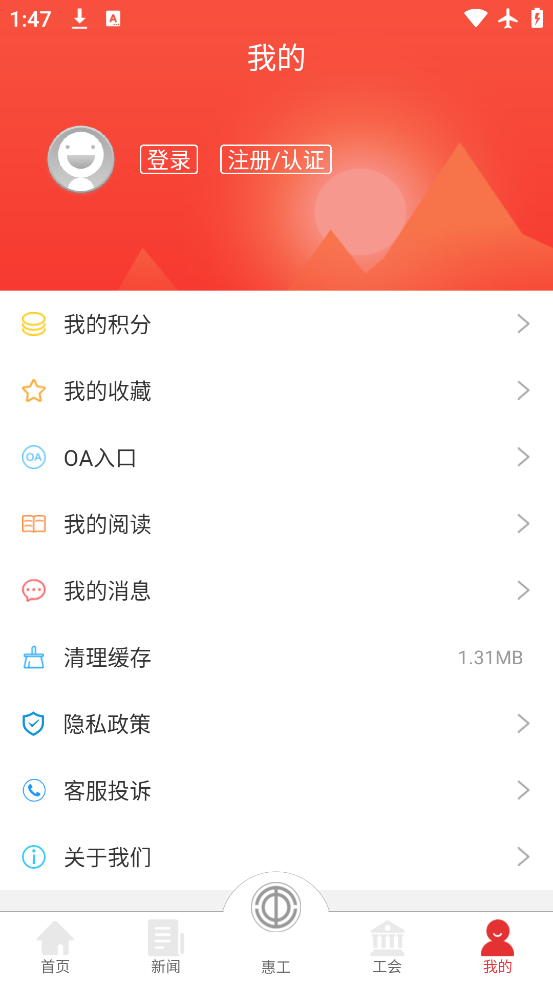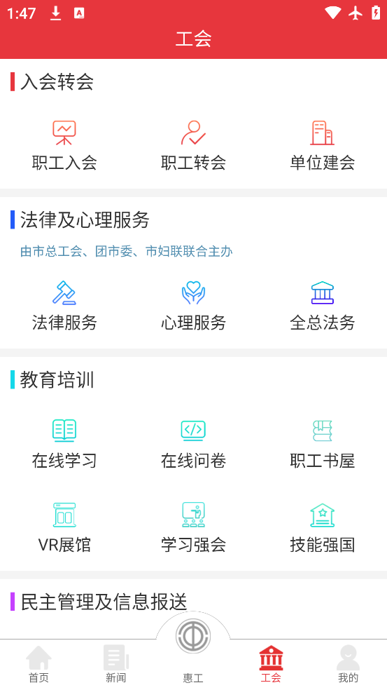 3、底部导航栏包含工会惠工新闻我的四大模块。点击工会可办理入会、转会、建会申请;惠工模块提供超市秒杀、免费观影、文演抢票等服务;新闻板块实时更新政策资讯与工会动态。