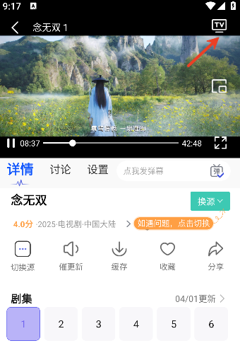 在播放详情页,点击箭头所指;