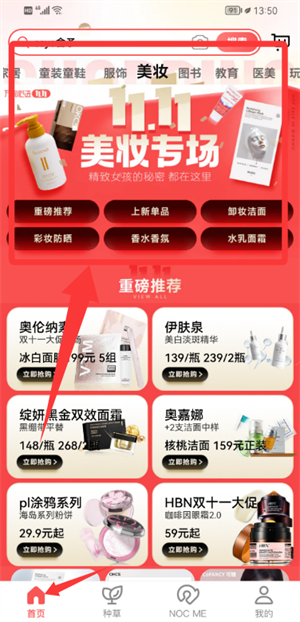 3、首页展示童装童鞋、服饰、美妆等品类,可点击进入专场选购。