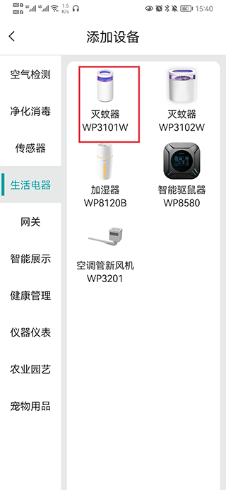 2、选择要添加的设备与型号,如灭蚊器 WP3101W。