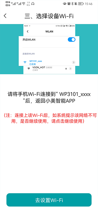 4、将手机WiFi连接到wp3101_xxxx后,就可以连接设备了。