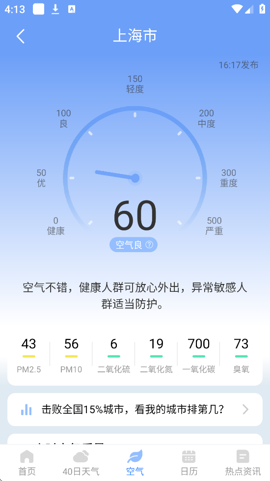 3、包含穿衣、防晒、钓鱼、运动等20多种生活指数,结合空气质量监测(如PM2.5、臭氧等),提供出行和健康防护建议。