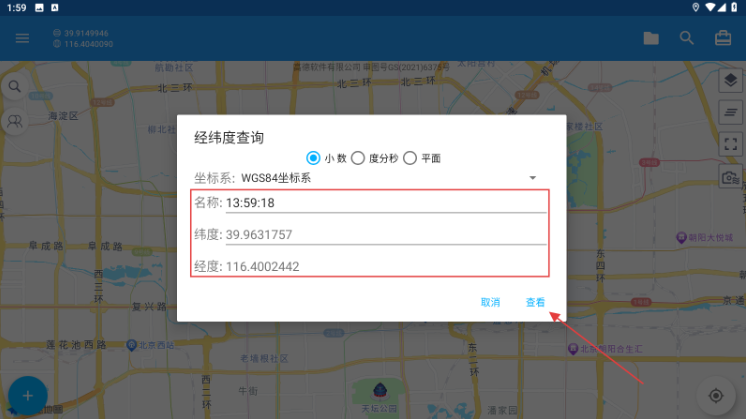 2、输入名称、经纬度,选坐标系,点【查看】定位。